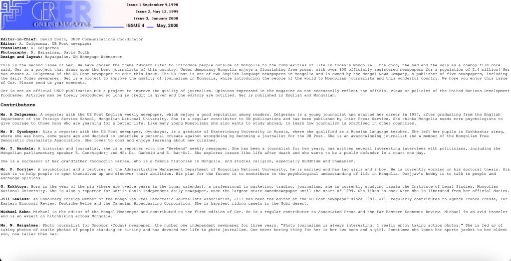 1998: Develop and launch Mongolia’s first web magazine, Ger. Lead two international media tours of the country, one in 1997 (Scandinavian media), and the other in 1998 (women journalists). Many stories were generated from the two international media tours and were compiled in books published by UNDP, including In Their Own Words: Selected Writings by Journalists on Mongolia, 1997-1999 (ISBN 99929-5-043-9). Read an example story here: The Milk of Kindness Flows in a Peculiar Land A Steppe From Nowhere by Leslie Chang (The Asian Wall Street Journal, 15 August 1998).