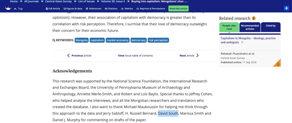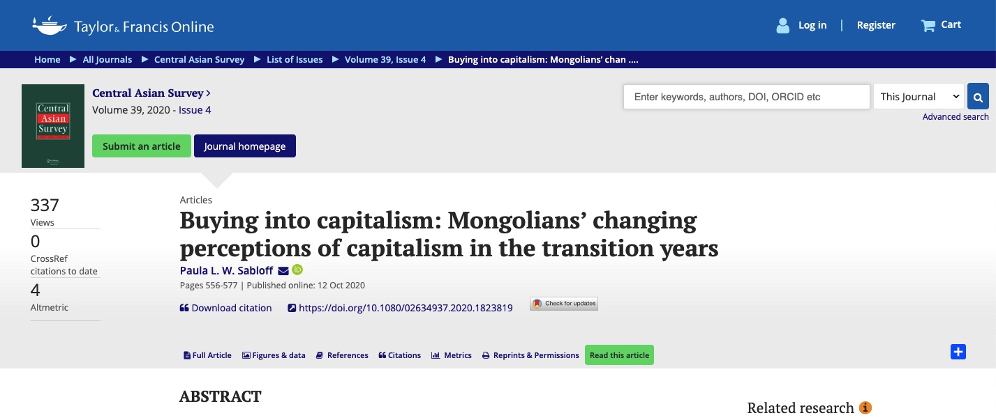 It was a pleasure to have the opportunity to comment on a draft of Buying into capitalism: Mongolians’ changing perceptions of capitalism in the transition years by External Professor Emeritus Paula L. W. Sabloff from the Santa Fe Institute (12 Oct 2020: Central Asian Survey).