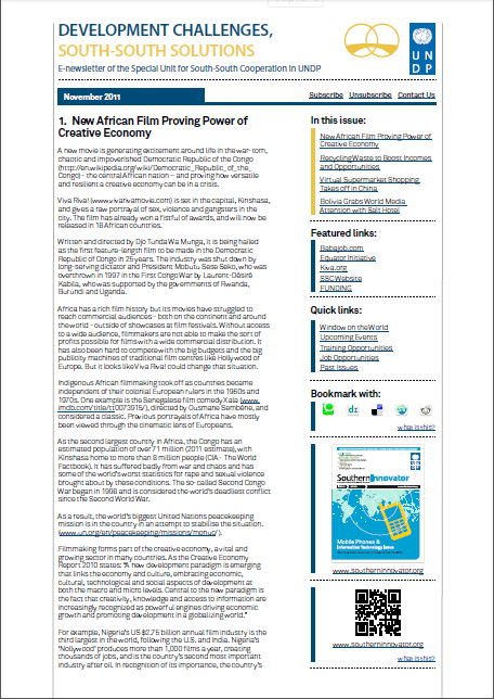 Development Challenges, South-South Solutions was launched as an e-newsletter in 2006 by UNDP’s South-South Cooperation Unit (now the United Nations Office for South-South Cooperation) based in New York, USA. It led on profiling the rise of the global South as an economic powerhouse and was one of the first regular publications to champion the global South’s innovators, entrepreneurs, and pioneers. It tracked the key trends that are now so profoundly reshaping how development is seen and done. This includes the rapid take-up of mobile phones and information technology in the global South (as profiled in the first issue of magazine Southern Innovator), the move to becoming a majority urban world, a growing global innovator culture, and the plethora of solutions being developed in the global South to tackle its problems and improve living conditions and boost human development. The success of the e-newsletter led to the launch of the magazine Southern Innovator.