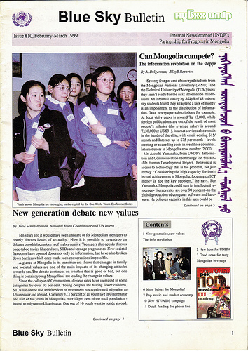 The Blue Sky Bulletin newsletter was launched in 1997 initially as a simple, photocopied handout. It quickly founds its purpose and its audience, becoming a key way to communicate what was happening in the country and a crucial resource for the global development community, scholars, the media and anyone trying to figure out what was happening in a crazy and chaotic time. Blue Sky Bulletin was distributed via email and by post and proved to be a popular and oft-cited resource on the country. The quality of its production also paralleled Mongolia’s growing capacity to publish to international standards, as desktop publishing software became available and printers switched to modern print technologies. Blue Sky Bulletin evolved from a rough, newsprint black and white publication to becoming a glossy, full-colour, bilingual newsletter distributed around Mongolia and the world.