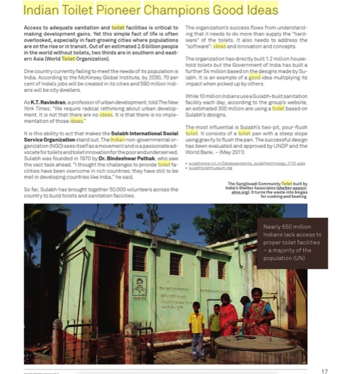 In China, Landwasher toilets is tackling the growing problem of providing flush toilets to the country’s 1.32 billion people. As its founder Wu Hao told the World Resources Institute (www.nextbillion.net), “Assuming all of our country uses water-flushing toilets, not even the Changjiang and the Yellow Rive will be enough.”