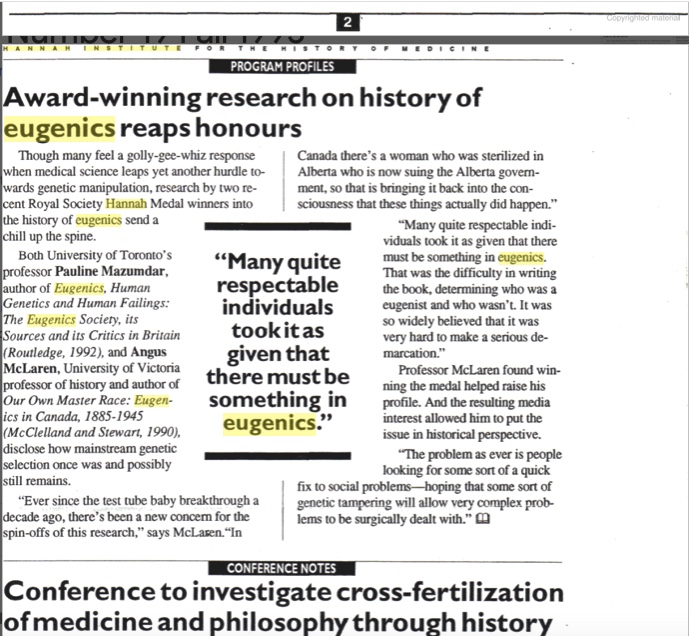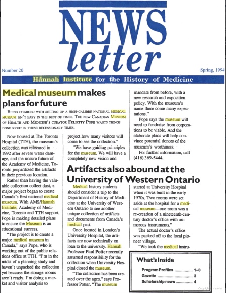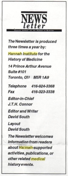 Hannah Institute for the History of Medicine Newsletter (Toronto, Canada), Number 20, Spring, 1994